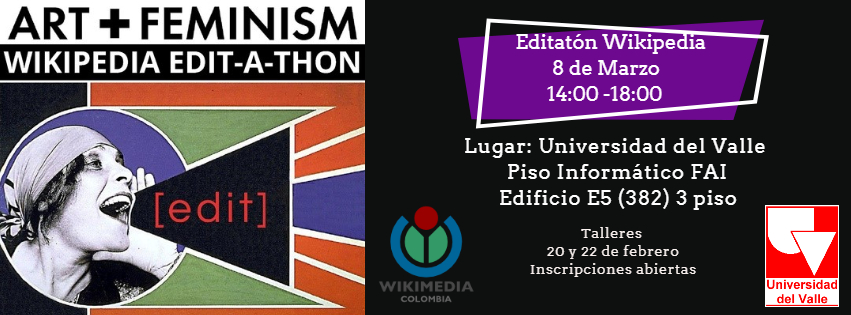Únase a nosotr@s en Universidad del Valle, Edificio E5 Piso Informático, el 8 de Marzo desde 2:00 PM hasta 6:00 PM para una jornada comunitaria de actualización de los artículos en Wikipedia sobre temas relacionados con el género, el arte y el feminismo. Proporcionaremos tutoriales para principiantes en Wikipedia, materiales de referencia, cuidado de niñ@s y refrigerio. Se requiere inscripción previa para el ingreso al lugar del evento. Si no desea editar, le pedimos que se asista para mostrar su apoyo a la campaña. El cuidado de infantes requiere registrarse con anticipación; comuníquese al estefanny.sandoval@
